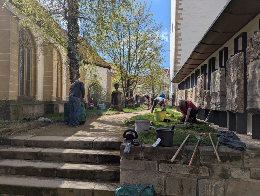 Unter fachmännischer Anleitung des Domküsters Holger Graf wurde altes Laub gesammelt, wurden die Schnittgerinne gesäubert und unerwünschtes Begleitgrün an den Rasenkanten entfernt.
